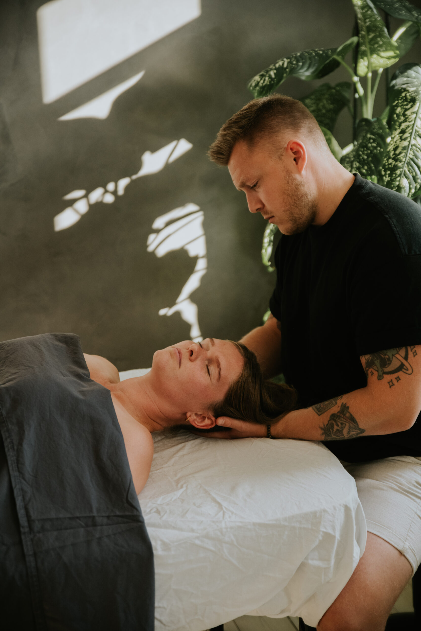 Læg dig behageligt og træk vejret roligt ind gennem næsen og ud gennem munden. Når rytmen er der, så begynd at mærke din krop for spændinger. Brug vejrtrækningen til at komme i kontakt med spændingen og blødgør den.